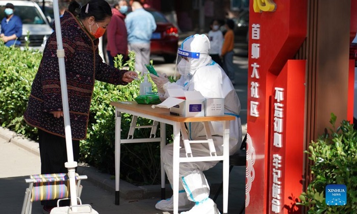 Ein Sanitäter entnimmt einem Bewohner einer Gemeinde im Bezirk Haidian in der chinesischen Hauptstadt Beijing am 13. Mai 2022 einen Abstrich für einen Nukleinsäuretest. Die Stadt hat von Freitag bis Sonntag drei weitere Runden von Nukleinsäure-Massentests in zwölf Bezirken gestartet. Wegen den wiederaufflammenden Infektionen befindet sich Beijing in einem Rennen gegen die Zeit. Foto: Xinhua.