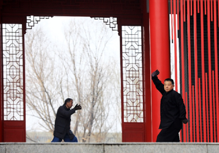 In Bewegung bleiben: Am frühen Morgen machen diese älteren Männer im Bochishan-Park in Huai'an in der Provinz Jiangsu Frühsport. (Foto: 5. März 2025)