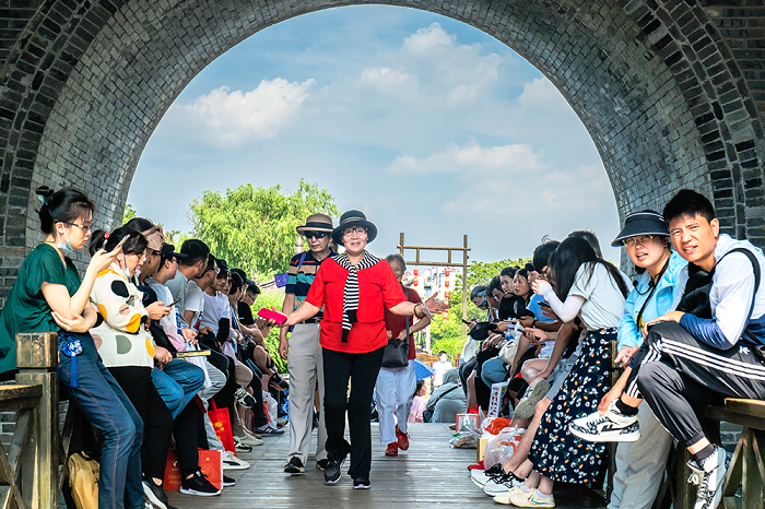 Kein bisschen müde: Dieses ältere Pärchen mischt sich bei einem Ausflug zum Dongguan-Stadttor in Yangzhou in der Provinz Jiangsu unters Volk. (Foto: 11. Juni 2023)