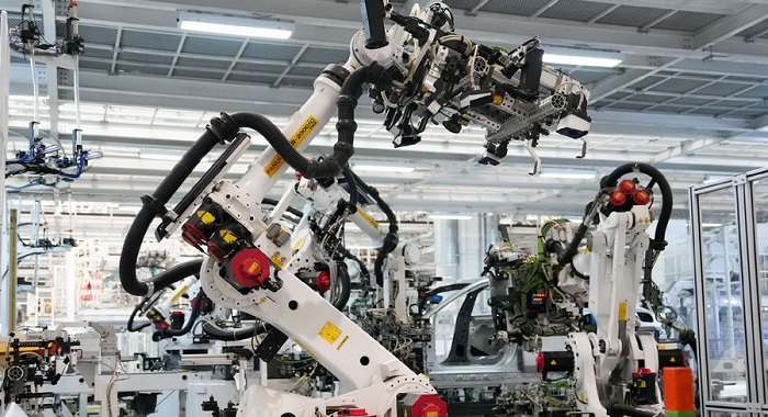 Ein Roboter arbeitet an der Produktionslinie im Automobilwerk von Xiaomi in Beijing. (Foto: Zheng Huansong/ Xinhua)