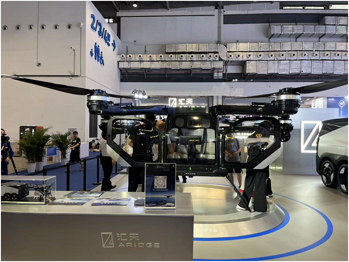 Ein silbergraues, stromlinienförmiges Fahrzeug, umgeben von Blitzlichtgewitter, ist besonders auffällig. Das ist der „Land Aircraft Carrier“ Aridge, ein zweiteiliges Flugauto für Straße und Luft von der Guangdong Huitian Aerospace Technology Co., Ltd.