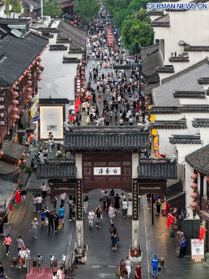 Die Drohnenaufnahme zeigt Touristen beim Besuch des sehenswerten Fuzi-Tempels (Konfuzius-Tempel) in Nanjing in der Provinz Jiangsu in Ostchina, 7. Oktober 2025. Auch zum Ende der Ferienzeit zum Nationalfeiertag und zum Mondfest ist die Begeisterung der Touristen im ganzen Land ungebrochen. (Xinhua/Li Bo)