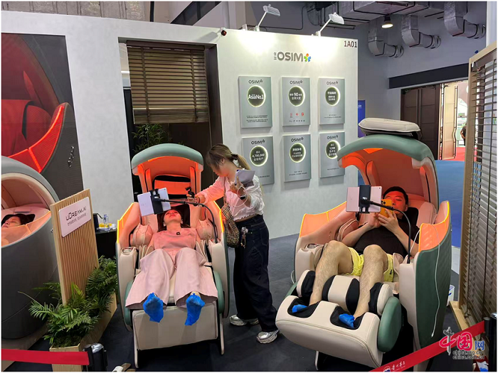 Besucher entspannen sich auf uDream AI, den KI-Flaggschiff-Massagesesseln von OSIM. (Foto vom 15. April 2026, Wang Ran/China.org.cn)